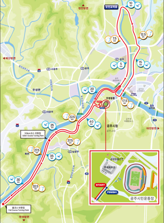 출발 및 도착 지점은 공주시민운동장으로, 공주를 대표하는 장소죠. 대회 당일에는 운동장과 주변이 마라톤 축제로 가득 찹니다.